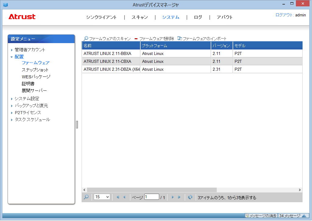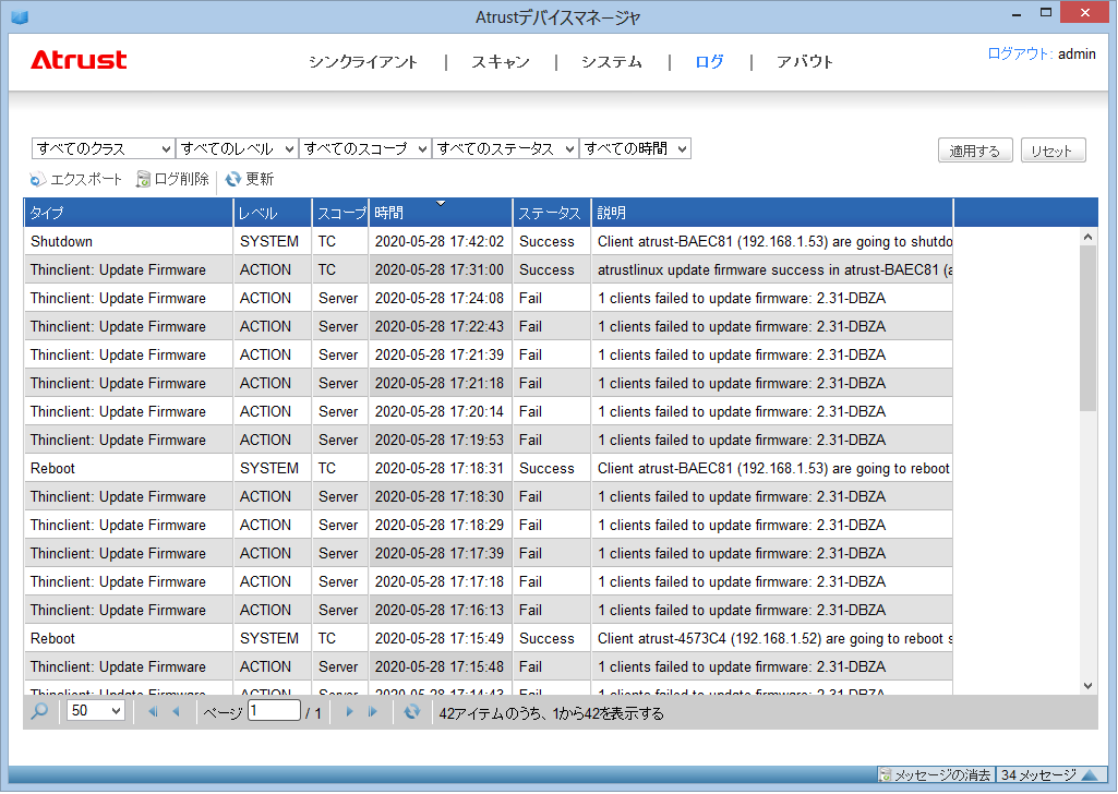 Atrust デバイスマネージャーのログを閲覧する事ができる画面です。どのユーザがいつ ADM にログインし、どのような設定を行ったのかなど、この画面から確認ができます。