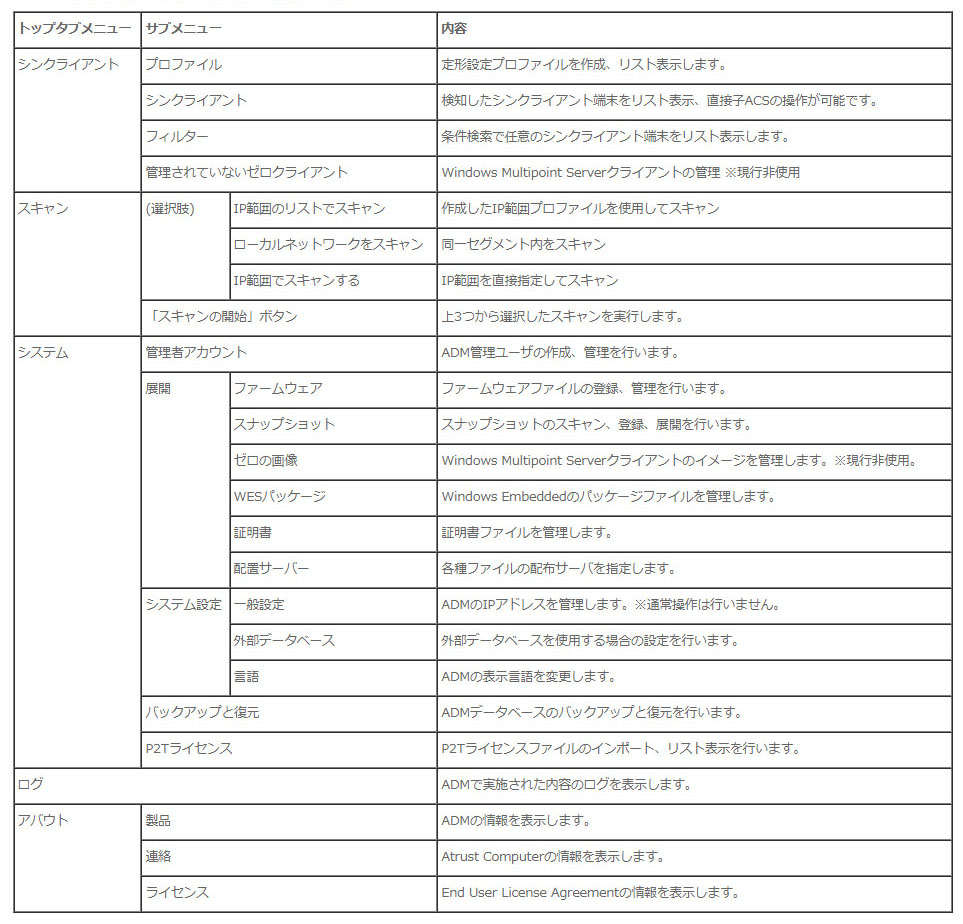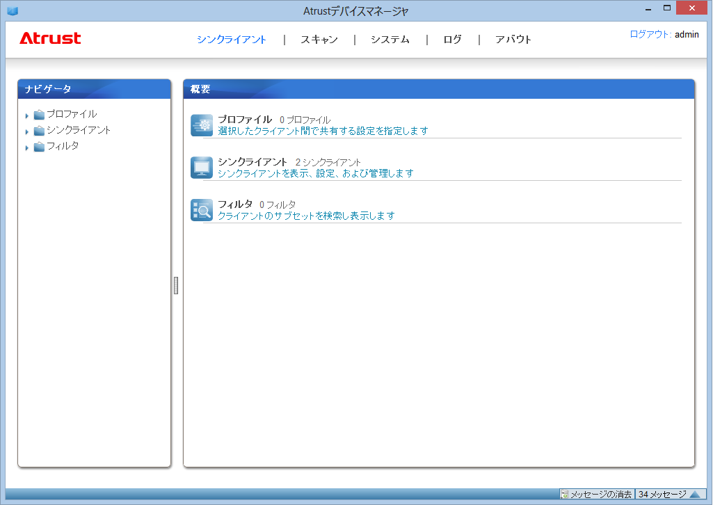 ADM のメイン画面です。 設定プロファイルを作成、保存や、検知したシンクライアントのリストを見ることが可能です。シンクライアントはフォルダ分け管理も可能です。フォルダ単位での設定の反映も可能です。
