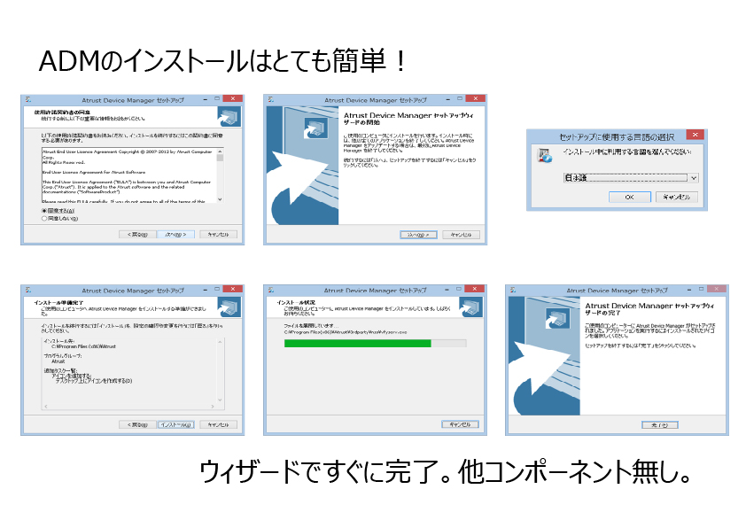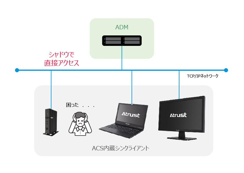 「シャドウ」機能を使用し、管理者は Atrust デバイスマネージャーから、特定のシンクライアントの画面を操作する事ができます。もし遠隔地のユーザーが何か操作に困った場合、サポートが可能です。