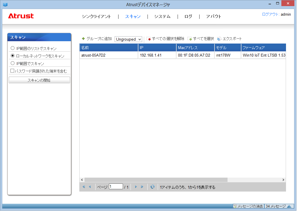 ネットワーク内に存在するシンクライアントを検知する画面です。同一セグメントだけで無く、IP アドレス範囲を指定して違うネットワーク範囲から検知する事も可能です。